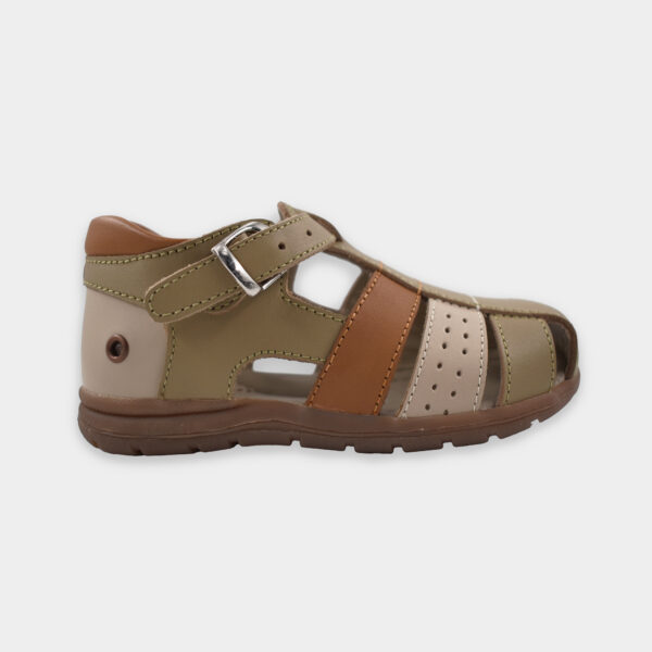 Está elaborada con materiales suaves y resistentes, ideales para el uso diario. Su diseño en tonos tierra —verde oliva, beige y marrón— aporta un estilo clásico y fácil de combinar. La hebilla ajustable permite adaptar la sandalia al pie del niño, mientras que la suela flexible y antideslizante ofrece mayor confianza y estabilidad al caminar.