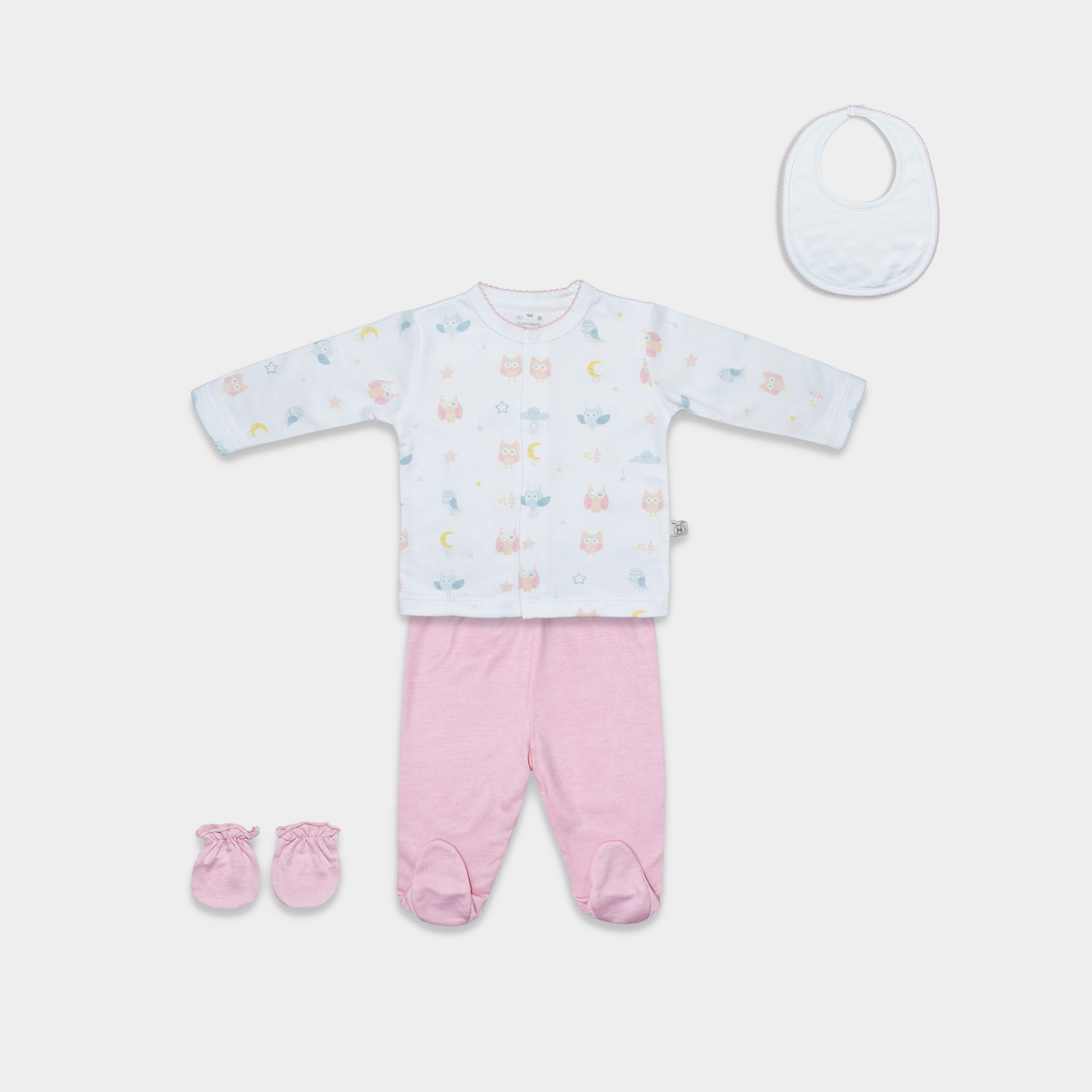 Ajuar para bebé con encantador diseño de buhita, confeccionado en algodón suave y transpirable que cuida la piel delicada del recién nacido. Su acabado cómodo y estilo tierno lo convierten en una opción ideal para quienes buscan calidad y dulzura en cada detalle.