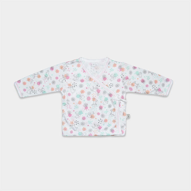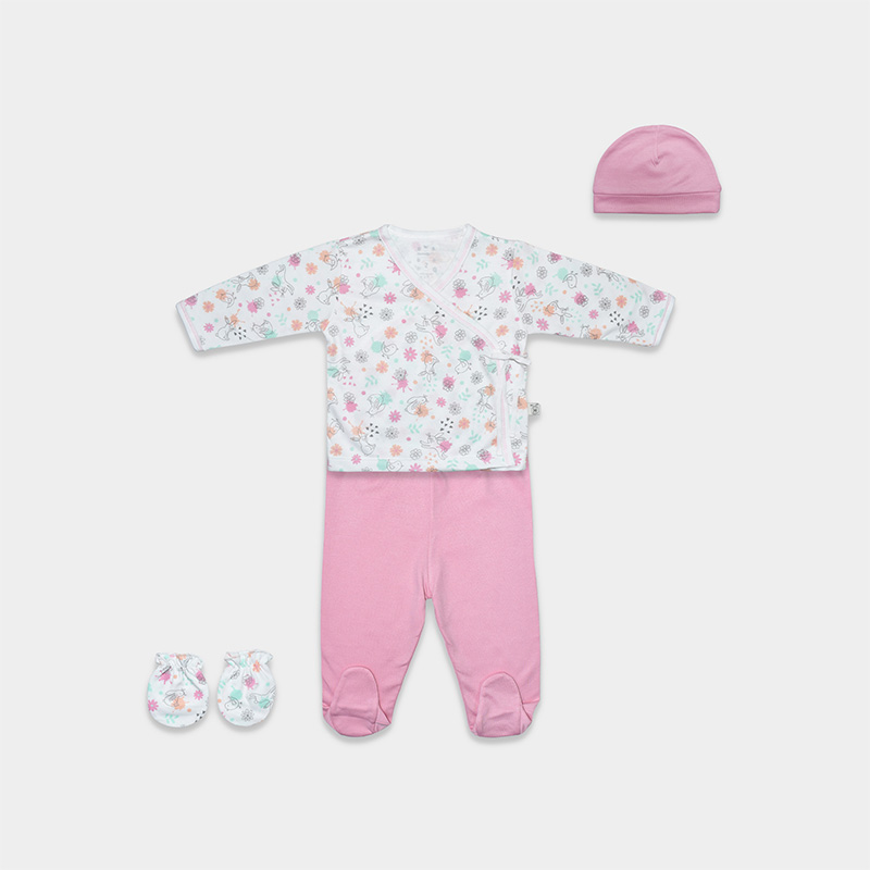 Ajuar de bebé en algodón suave color rosado y blanco con manchitas y diseño de conejitos. Delicado, cómodo y perfecto para los primeros días.