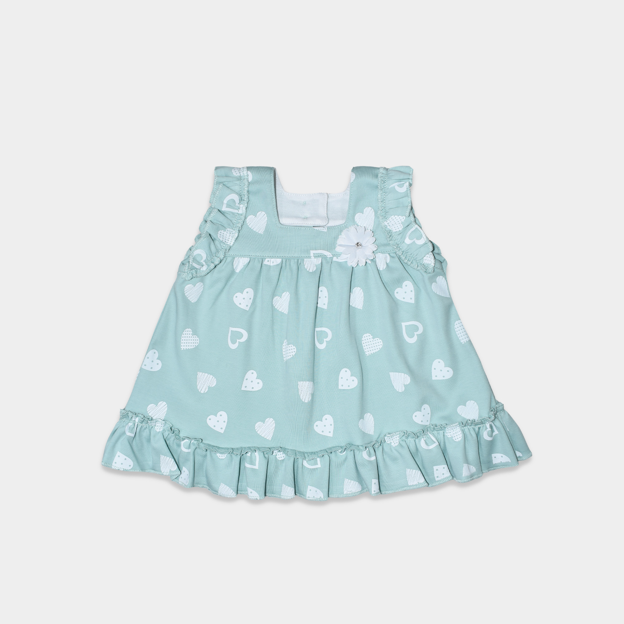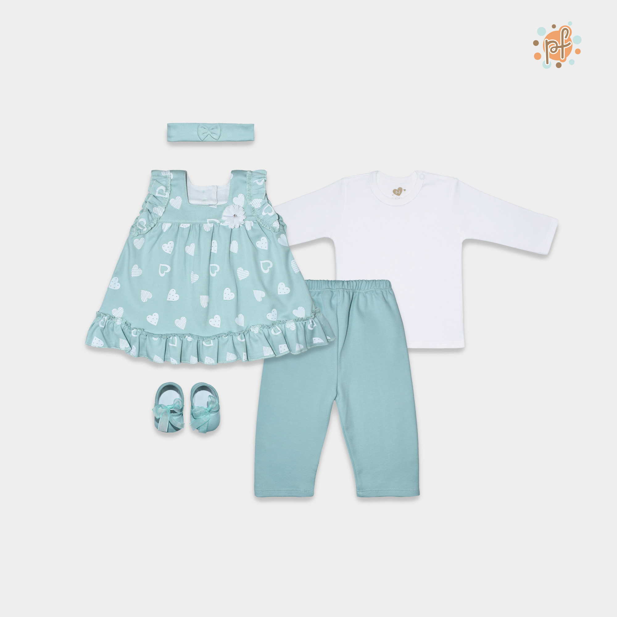 Ajuar de bebé de 5 piezas en algodón suave color verde cemento con diseño de corazones. Incluye prendas básicas y delicadas para máxima comodidad.