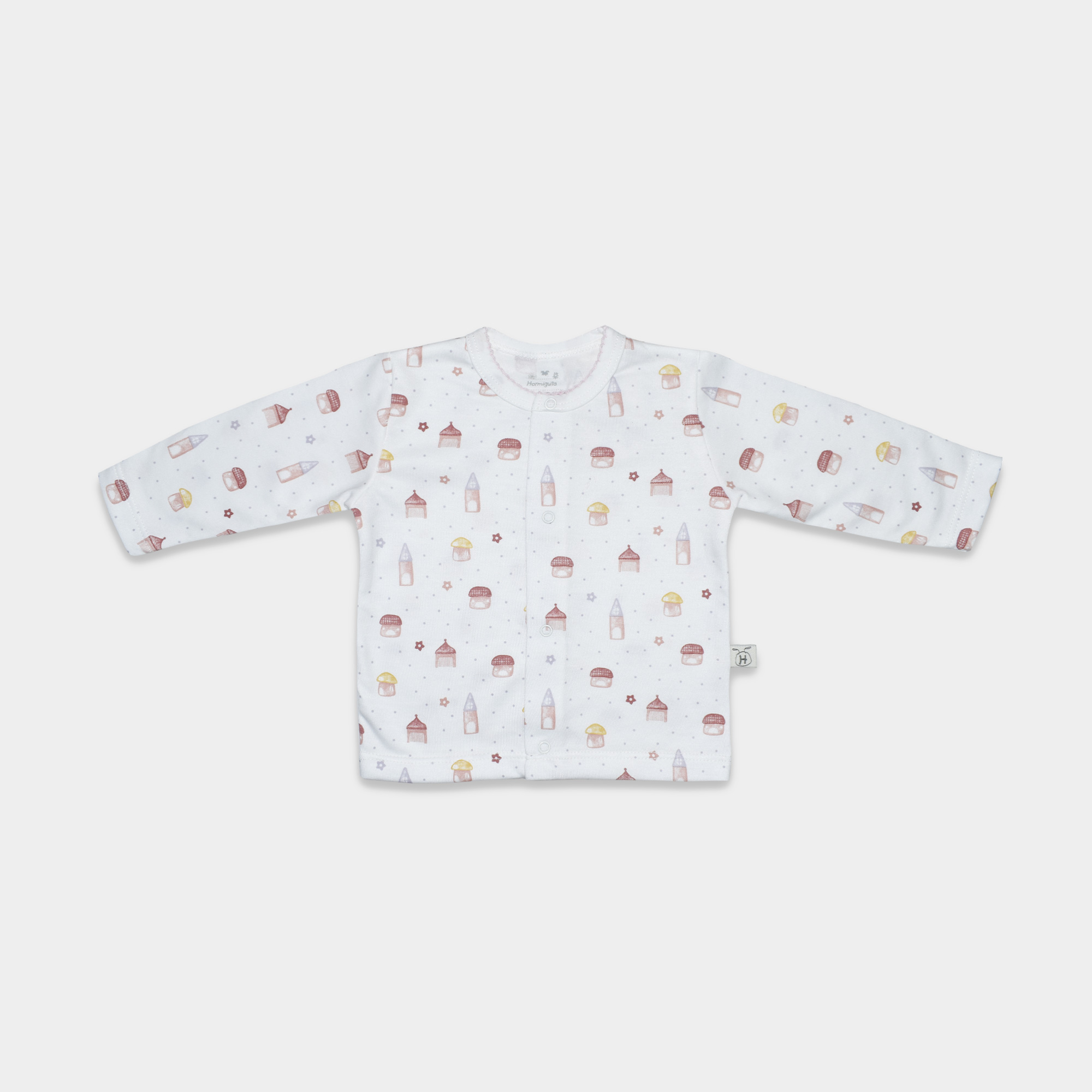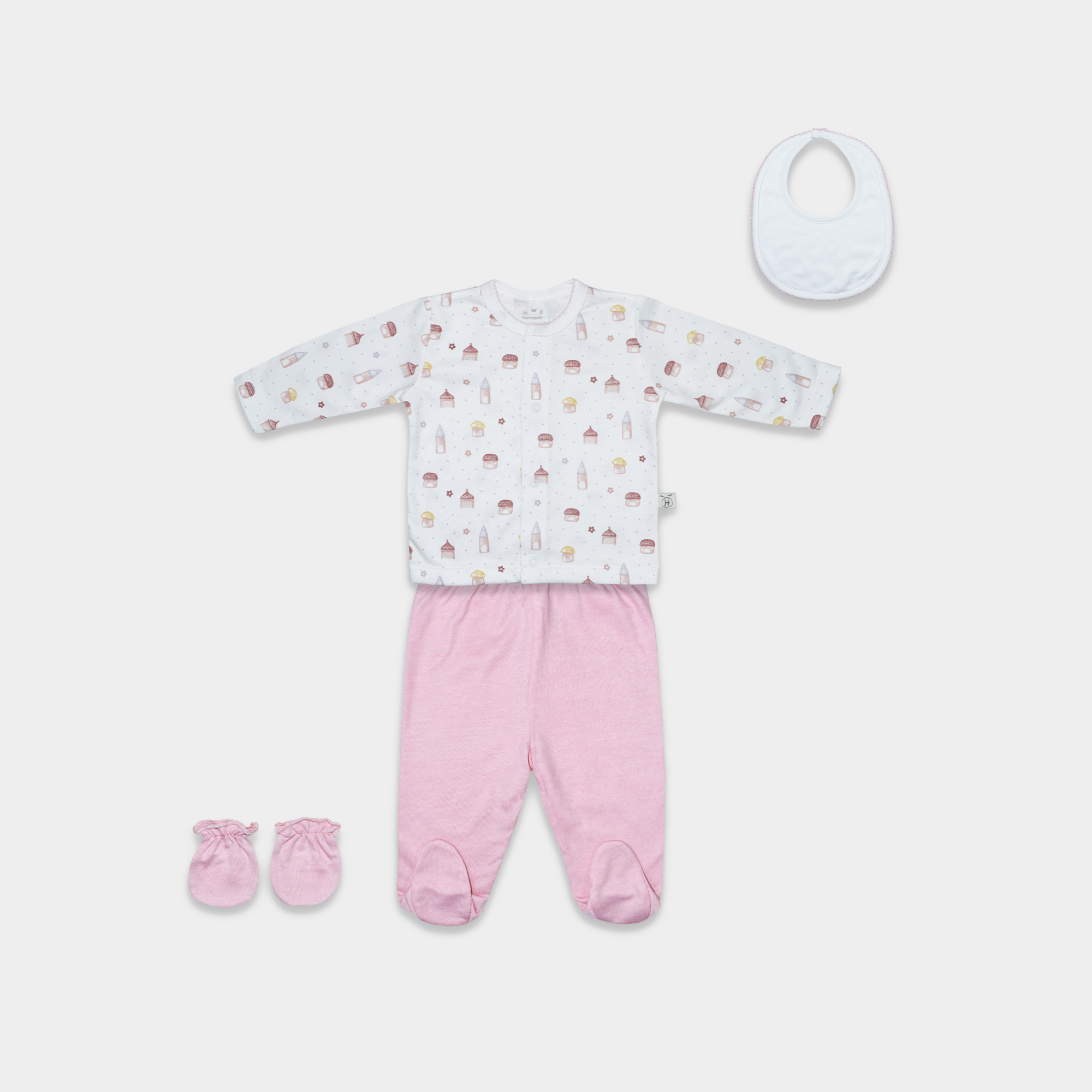 Ajuar de 4 piezas para bebé con tierno diseño de honguito, confeccionado en algodón suave y transpirable que cuida la piel sensible del bebe.