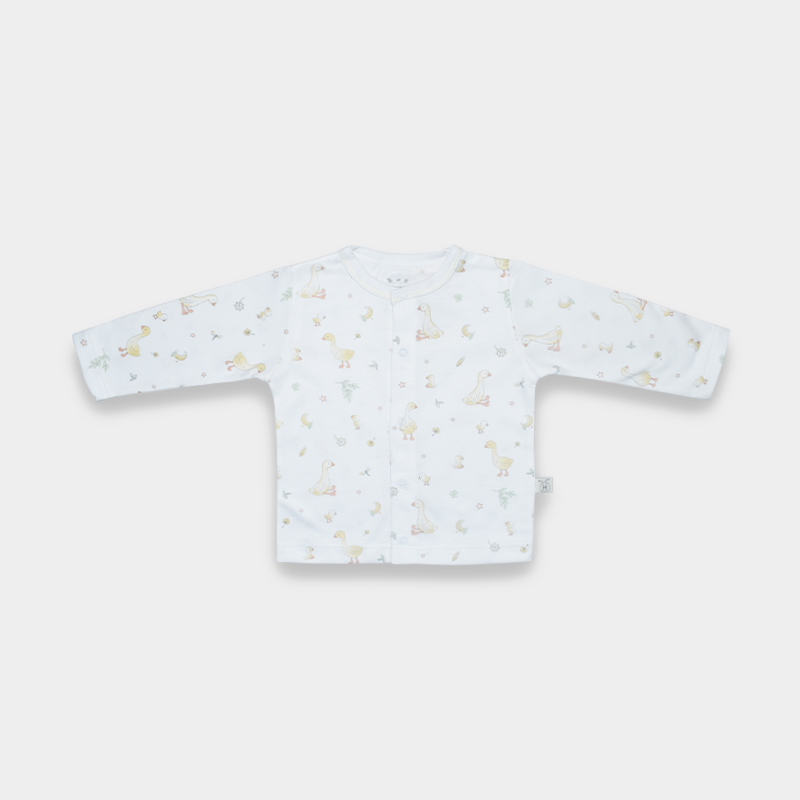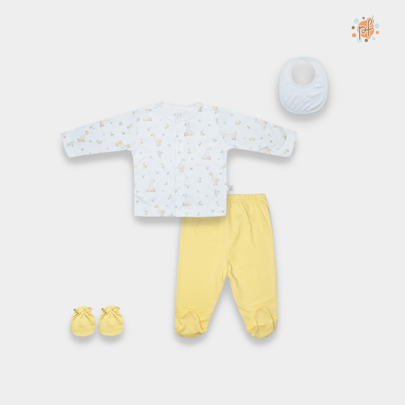 El Ajuar Gansitos para bebé es una opción encantadora y llena de ternura para los primeros días de tu pequeño. Su combinación en tonos blanco y amarillo, junto con el delicado diseño de gansitos, crea un look dulce, alegre y perfecto para acompañar sus primeros momentos.