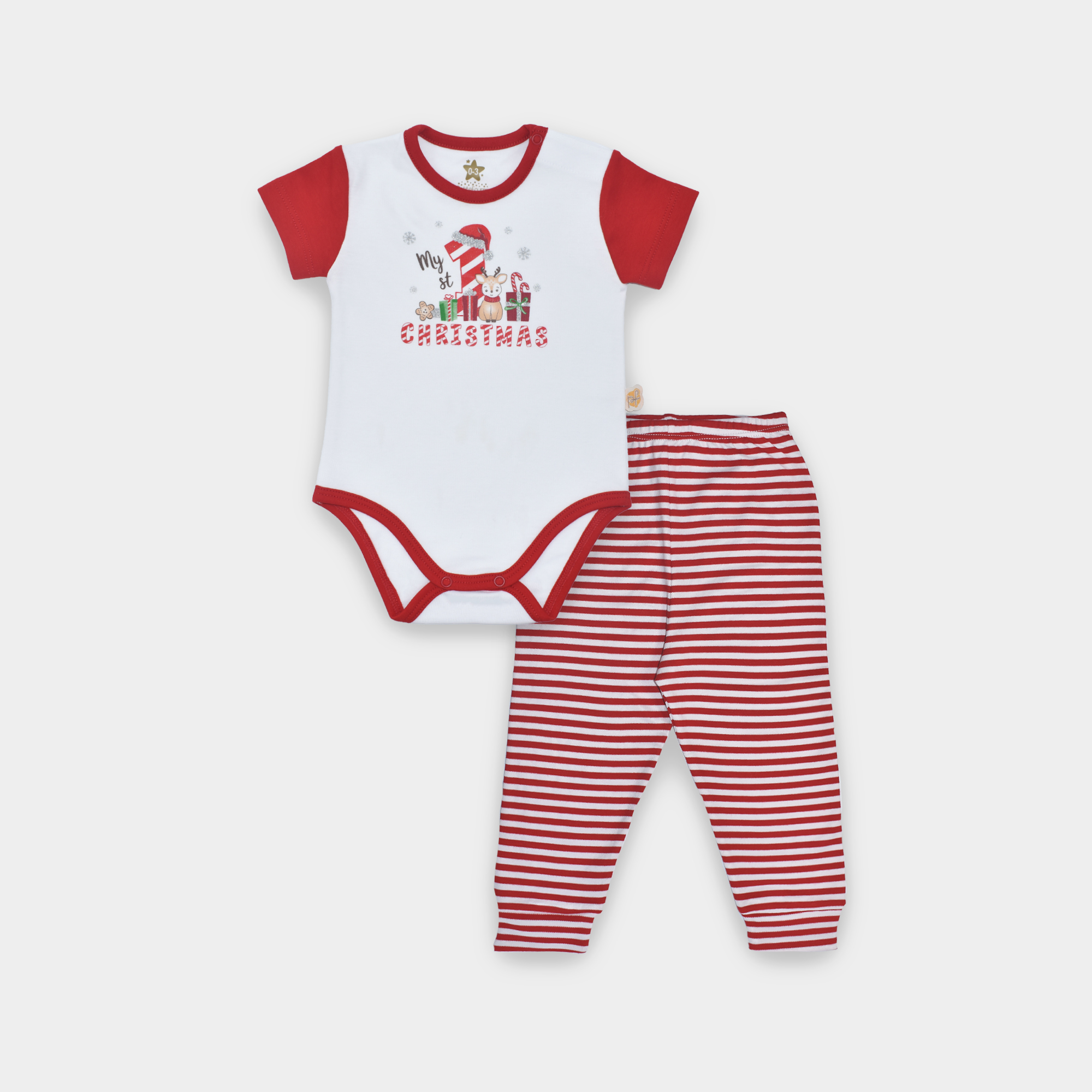 El Conjunto Navideño My 1st Christmas para Bebé es perfecto para vivir una Navidad llena de ternura, estilo y momentos inolvidables. Elaborado en 100% algodón, ofrece suavidad, frescura y total comodidad para la delicada piel de tu pequeño. Su diseño temático hace de cada foto y cada reunión un recuerdo especial que guardarás para siempre.
