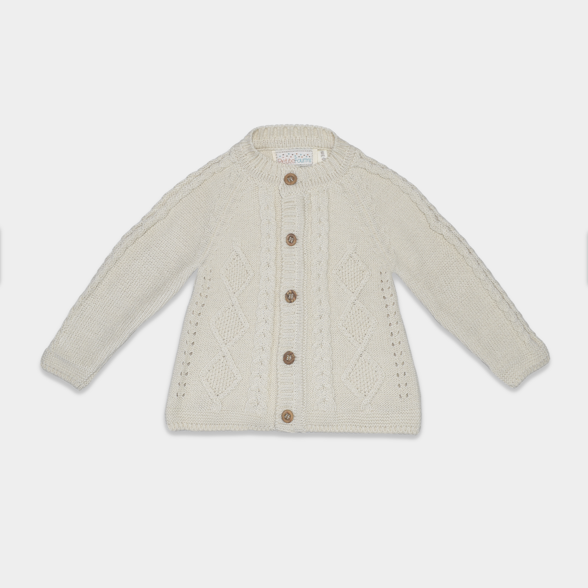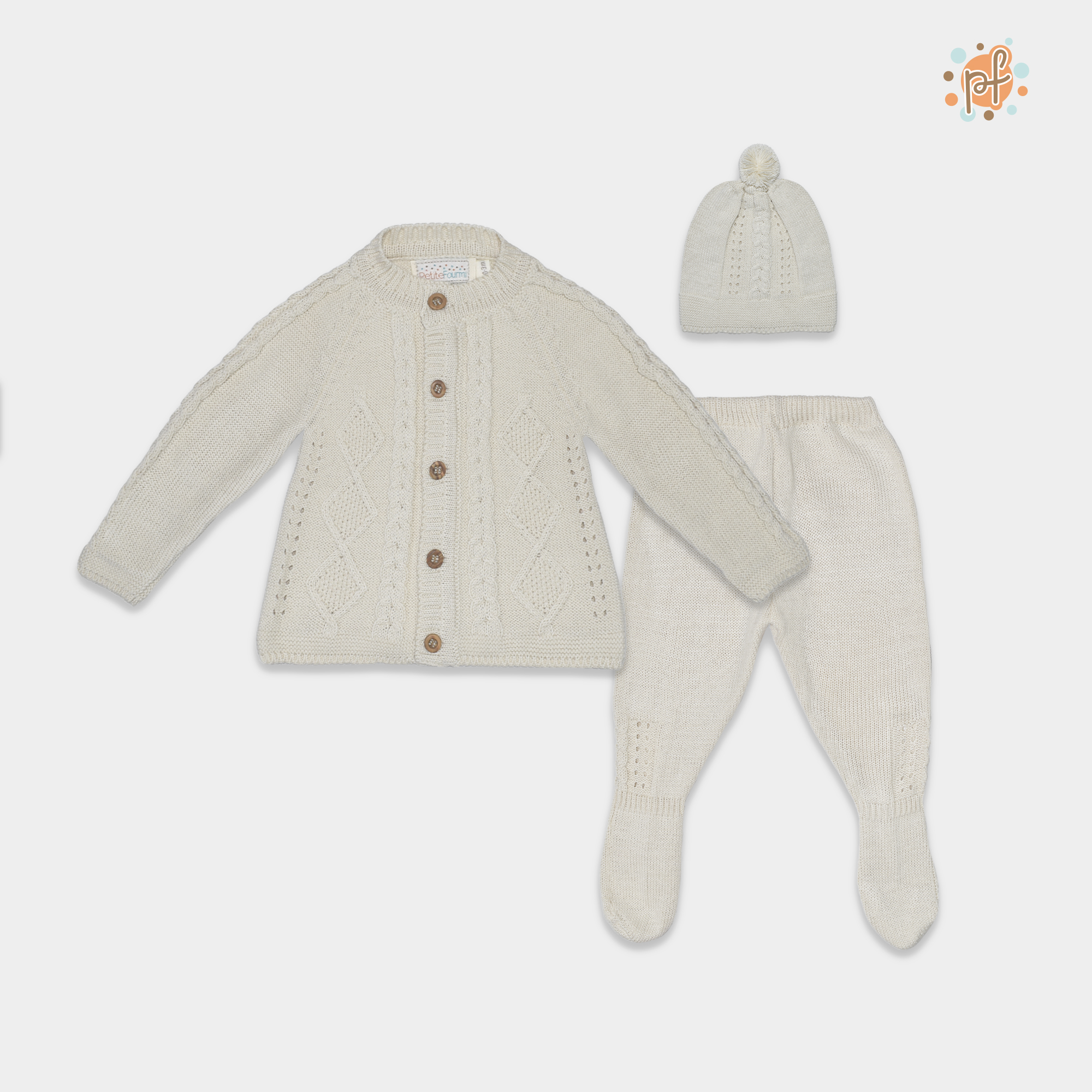 Hermoso conjunto tejido para bebé en color crudo, diseñado para brindar abrigo, suavidad y comodidad en los primeros meses de vida. Este delicado set incluye chompa tejida con botones, pantalón con pie y gorrito a juego, creando un look clásico y elegante para tu pequeño.