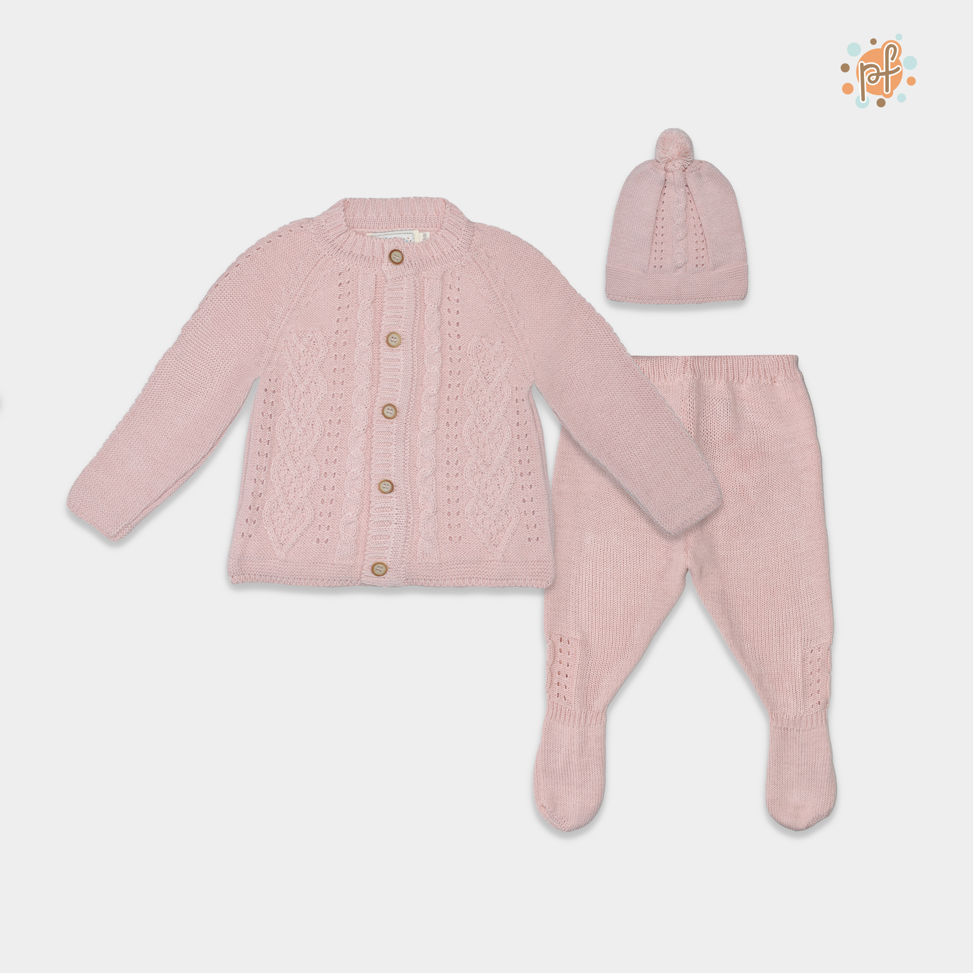 Hermoso conjunto tejido para bebé en color Palo rosa, diseñado para brindar abrigo, suavidad y comodidad en los primeros meses de vida. Este delicado set incluye chompa tejida con botones, pantalón con pie y gorrito a juego, creando un look clásico y elegante para tu pequeño.