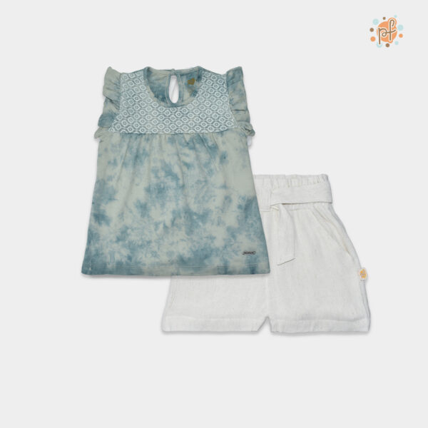 El polo de manga corta presenta un acabado marmoleado en tono verde cemento, que le da un estilo moderno y natural. Su diseño se realza con detalles de encaje en el pecho y volantes en las mangas, aportando un toque delicado y femenino. El short en tono claro, con cintura cómoda y ajuste suave, permite libertad de movimiento y completa un look armonioso y fresco.