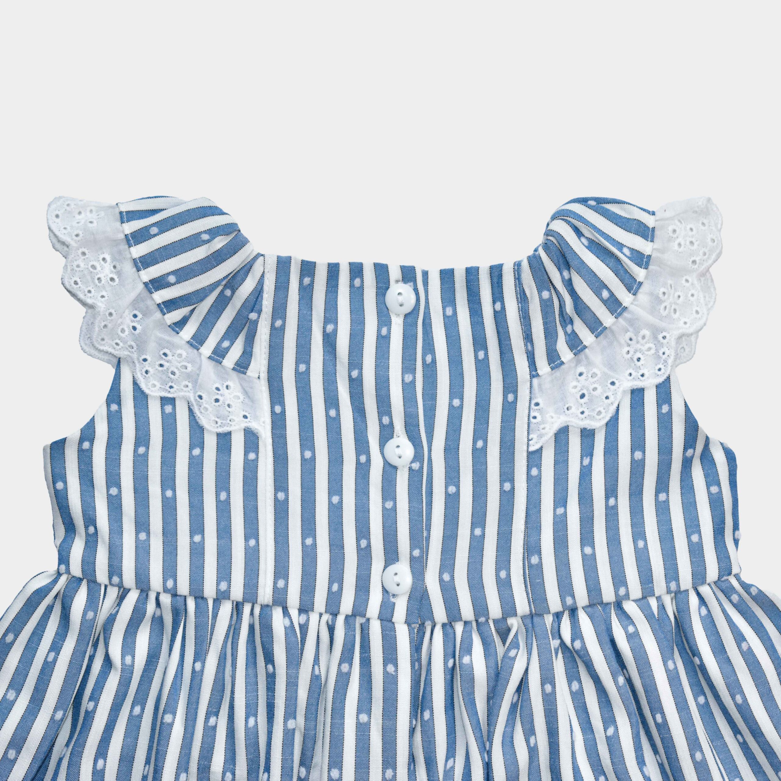 Elaborado con algodón plano, ofrece un tejido ligero y transpirable que mantiene a las pequeñas cómodas durante los días cálidos, permitiéndoles jugar y moverse con total libertad. Su diseño presenta delicadas rayas y aplicaciones de lazos, aportando un toque de elegancia clásica y encanto atemporal. Este modelo combina practicidad y estilo, adaptándose fácilmente a ocasiones cotidianas o salidas especiales.
