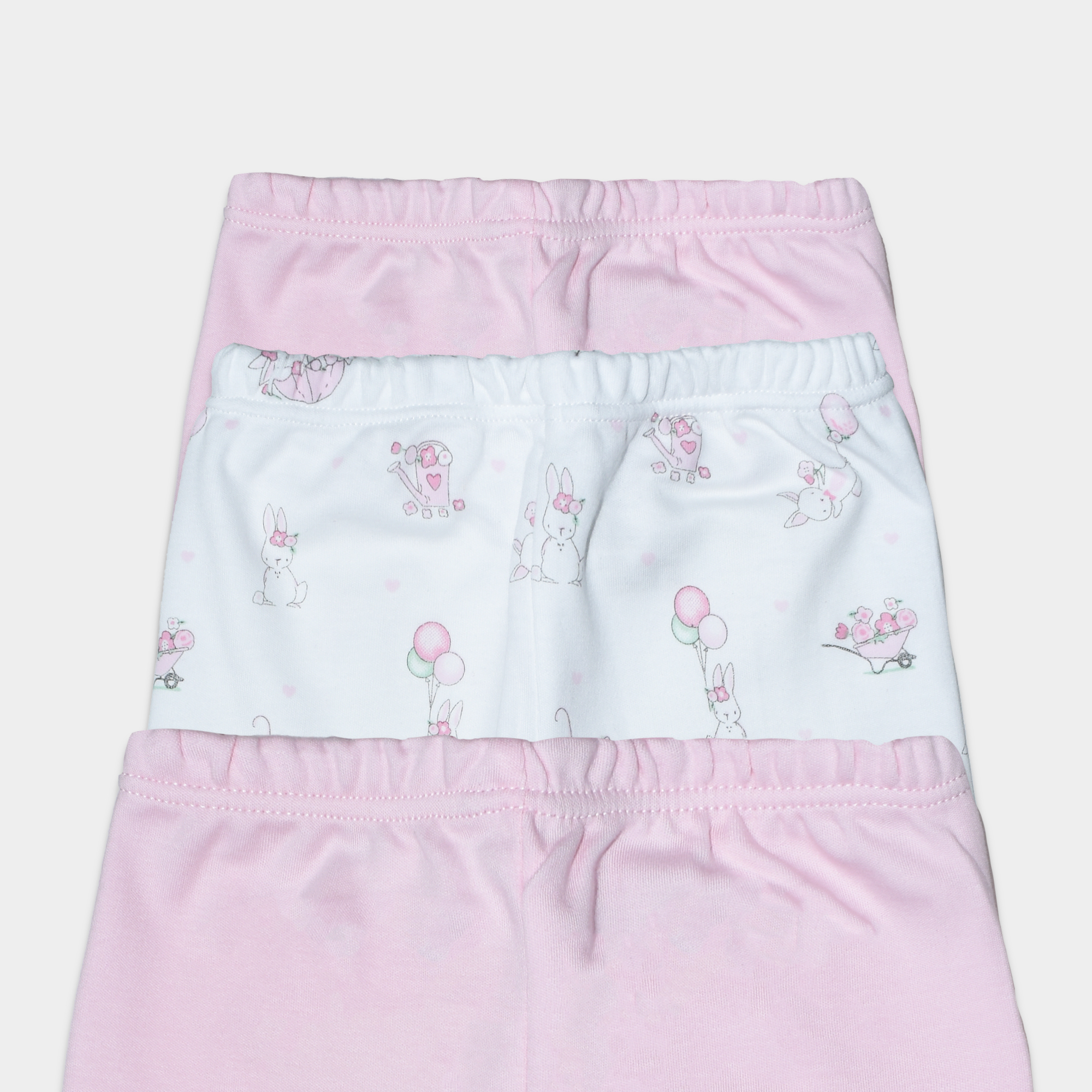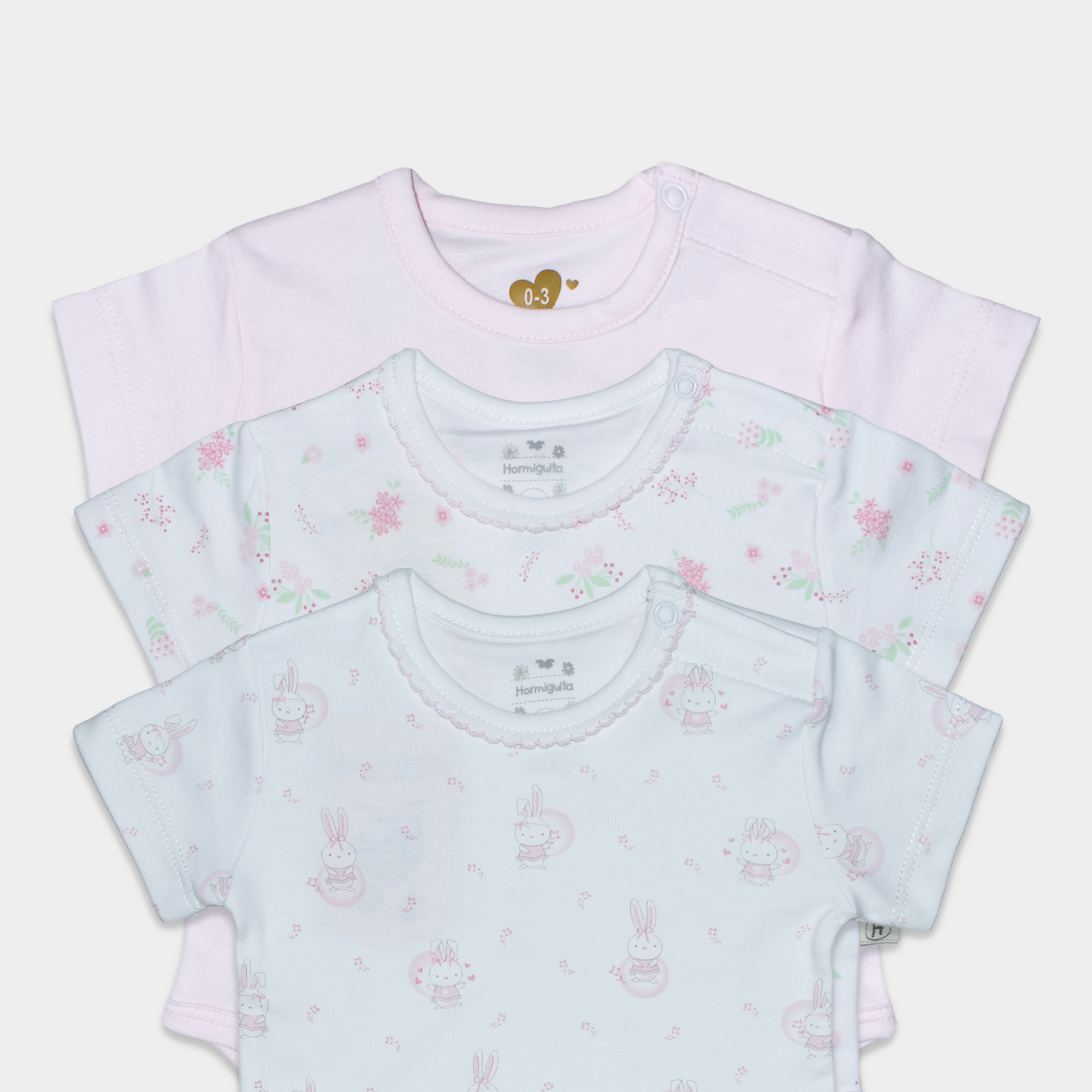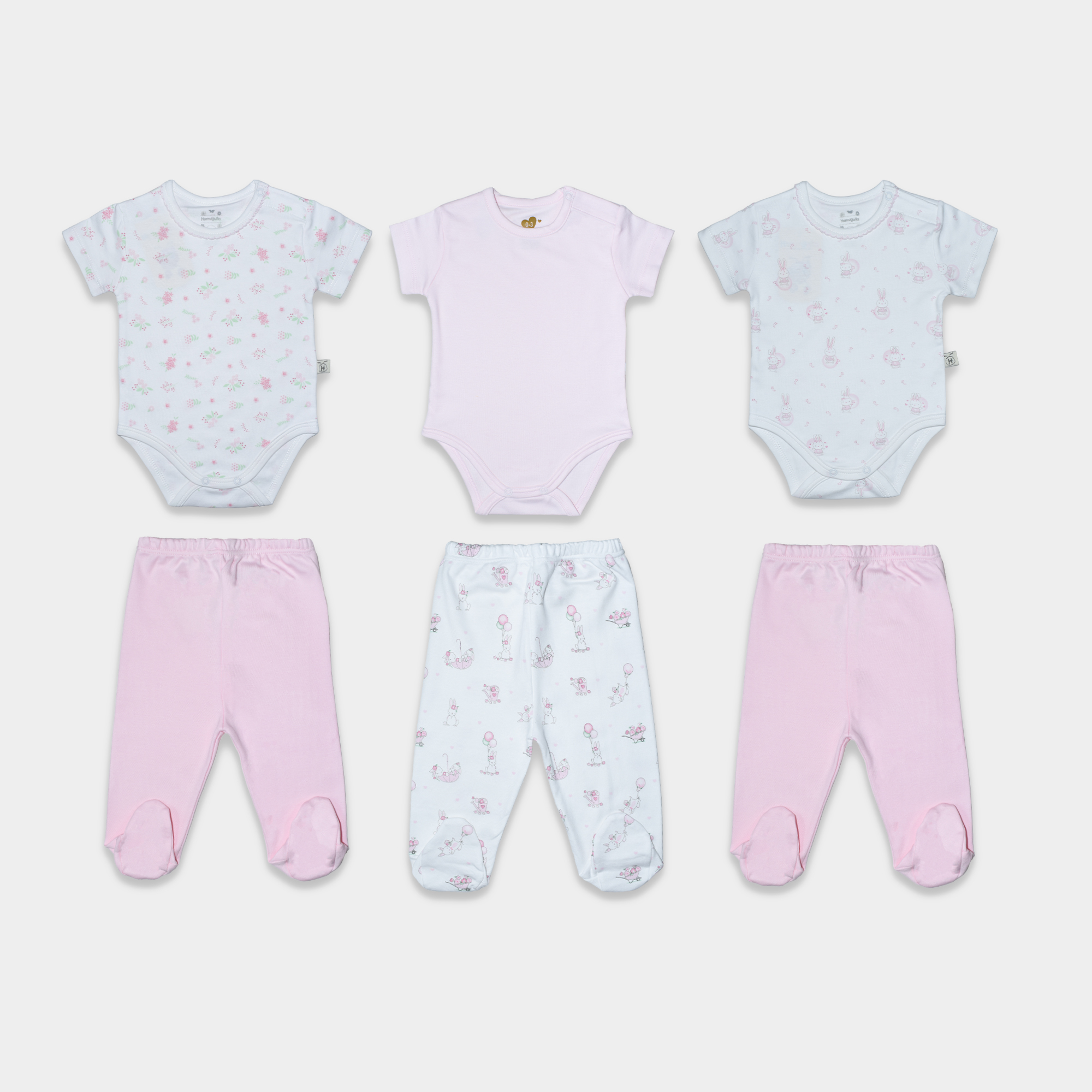 El Set 6 piezas Algodón Baby Bunny ha sido diseñado para brindar suavidad, confort y libertad de movimiento en cada etapa del crecimiento de tu bebé. Este set incluye tres bodies de manga corta y tres pantalones con piecito: un body rosado liso y dos bodies con estampados tiernos de flores y conejitos, combinados con pantalones en tonos suaves y armoniosos.