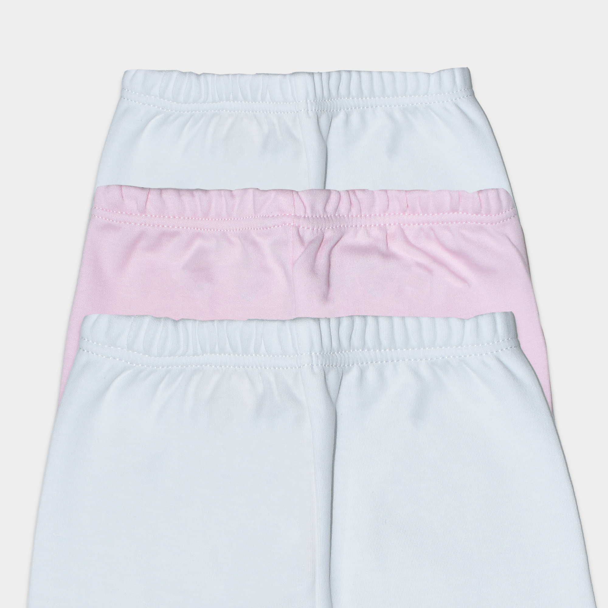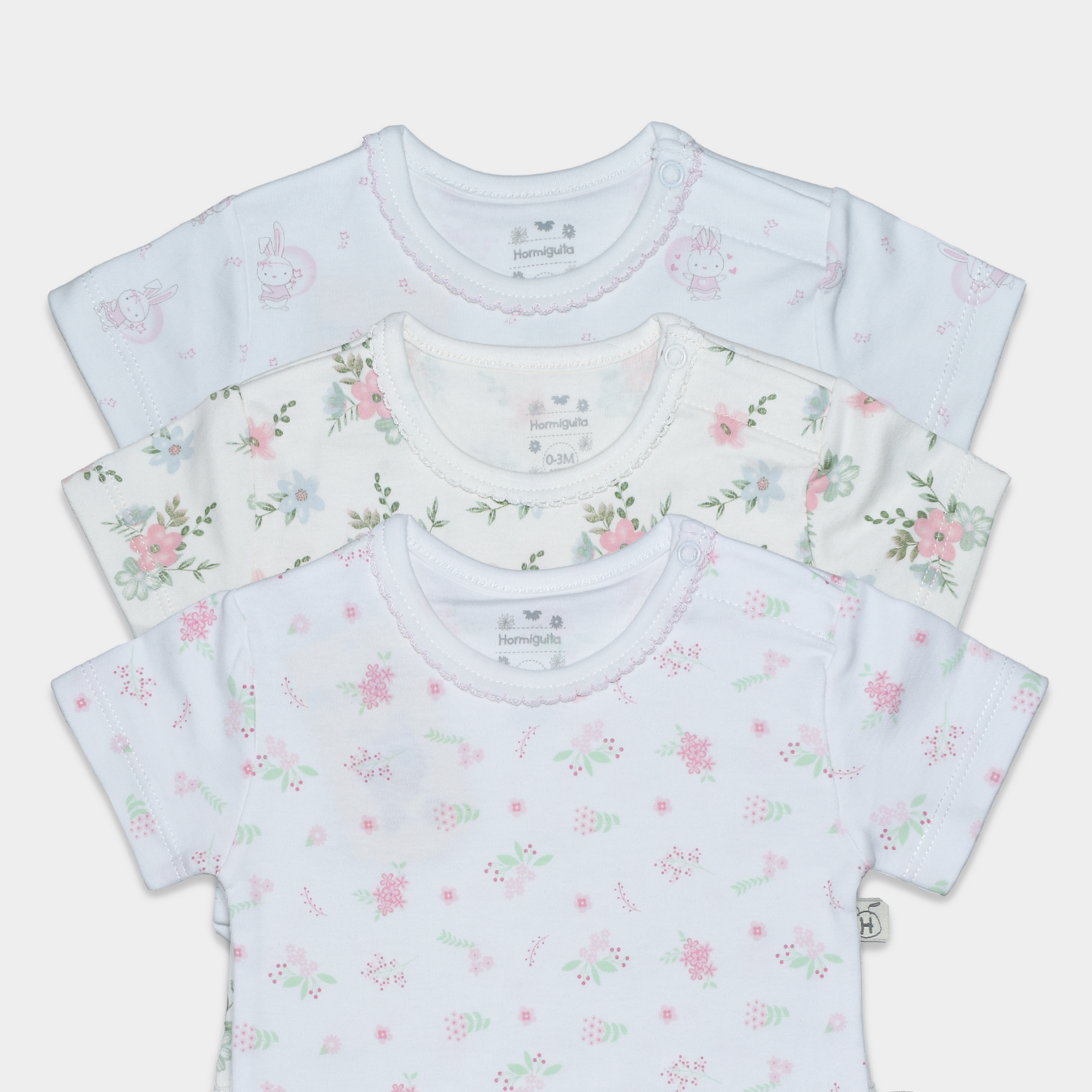 El set incluye bodys de manga corta con delicados estampados florales y pantalones en tonos suaves que combinan perfectamente entre sí, permitiendo crear distintos looks sin esfuerzo. Sus cortes cómodos facilitan el movimiento del bebé, mientras que los broches en la parte inferior de los bodys hacen más práctico el cambio de pañal.