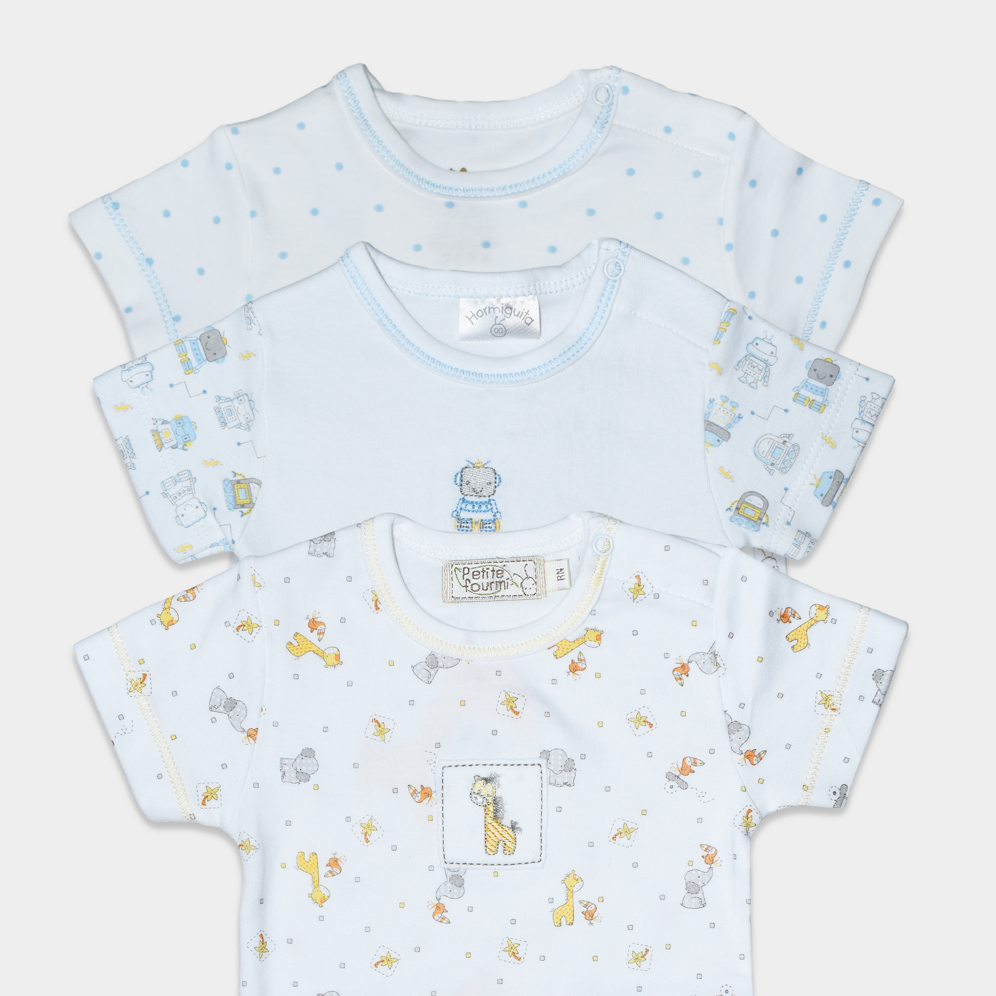 El Tripack body Algodón Dulce Pequeños Amigos ha sido diseñado para acompañar a tu bebé con suavidad, comodidad y libertad de movimiento en cada etapa del día. Este set incluye tres bodies de manga corta: uno en tono celeste con detalles estampados, uno blanco con pequeños puntos celestes y otro con tiernos animalitos en tonos suaves, logrando una combinación armoniosa y fácil de usar.