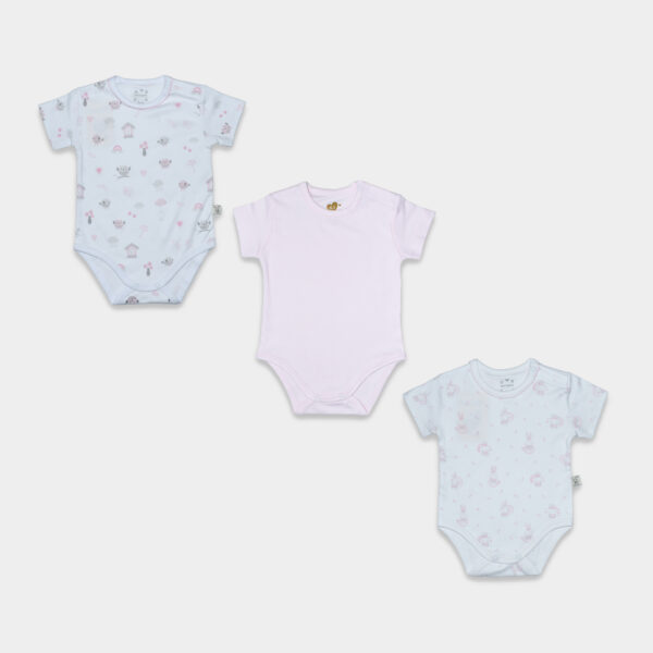El Set Bodys Algodón Bunny Love está elaborado en algodón suave y respirable, pensado para brindar máximo confort durante todo el día. Incluye tres bodys de manga corta: uno liso en tono rosado y dos con adorables estampados infantiles, fáciles de combinar y perfectos para cualquier ocasión.