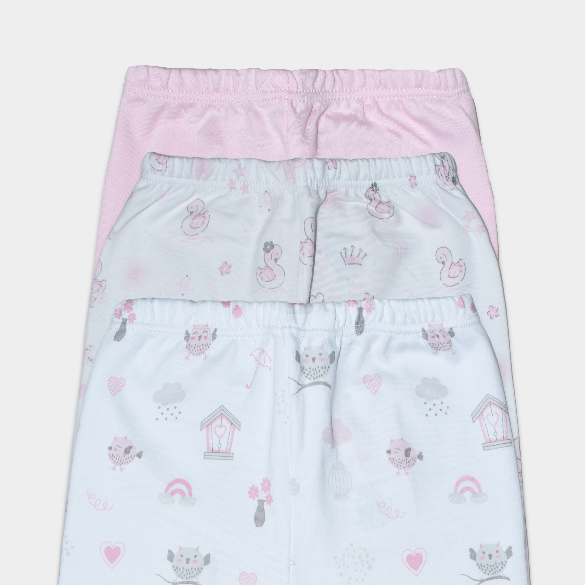 Este tripack incluye tres diseños encantadores: un pantalón en tono rosado, uno con estampado de búhos en tonos grises y rosados, y otro con delicados flamencos en colores grises y rosas. La pretina elástica asegura un ajuste cómodo y seguro, permitiendo que el bebé se mueva libremente sin molestias.